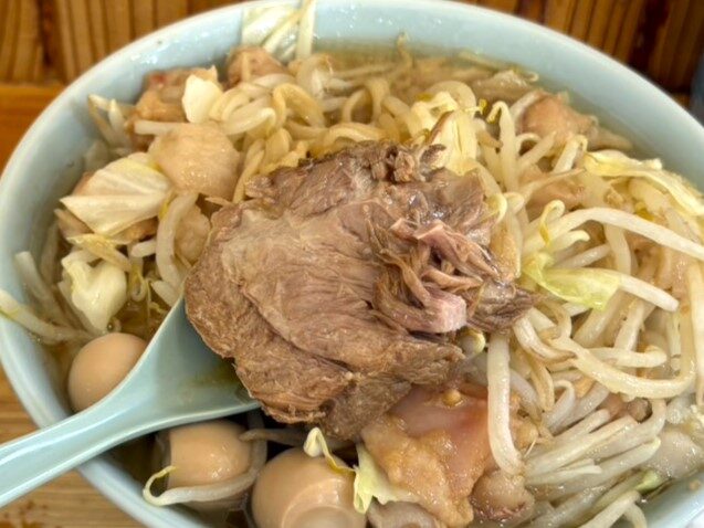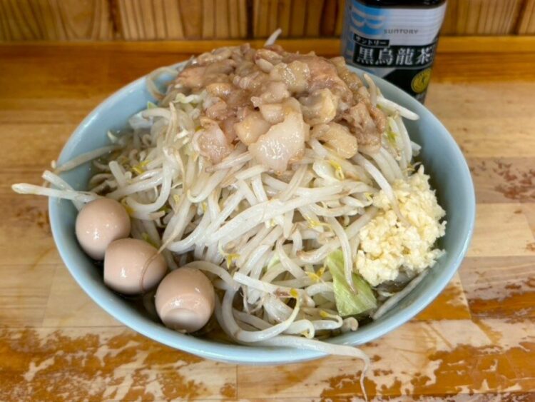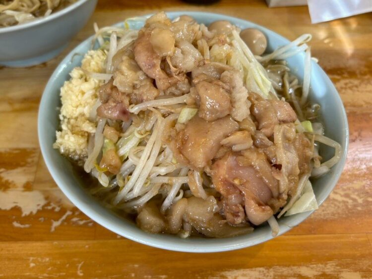 ワシワシと表現される極太麺、豚骨ベースの濃厚なスープに大量の茹で野菜。G系ラーメンの群馬御三家の1つと呼ばれているそうです。平日、開店時間の10分前に行ったのに長い行列ができていました。
