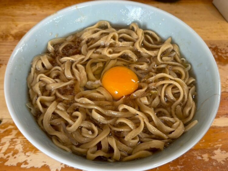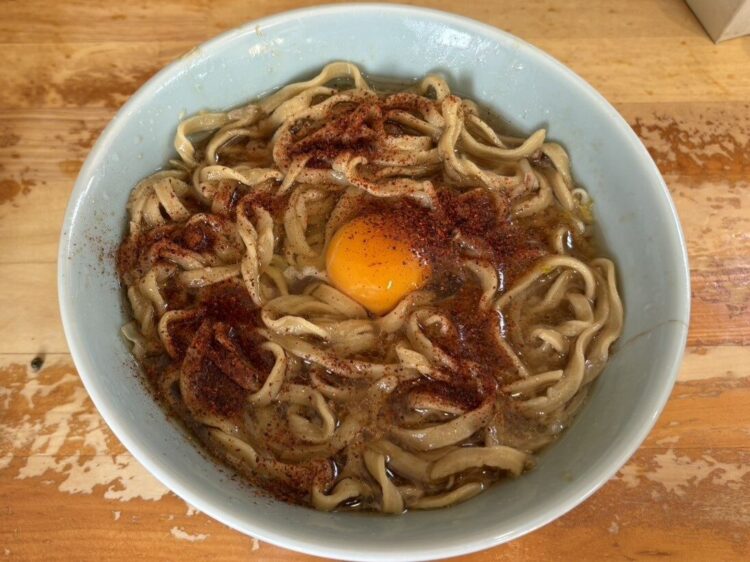 生玉子を加えたのは大正解。麺がつるっと食べやすくなり、スープもマイルドになりました。肉や野菜を絡めても美味しくいただけますよ。