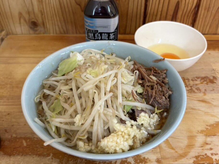 ▲「少なめ」にニンニク。奥は生卵と必需品の黒烏龍茶