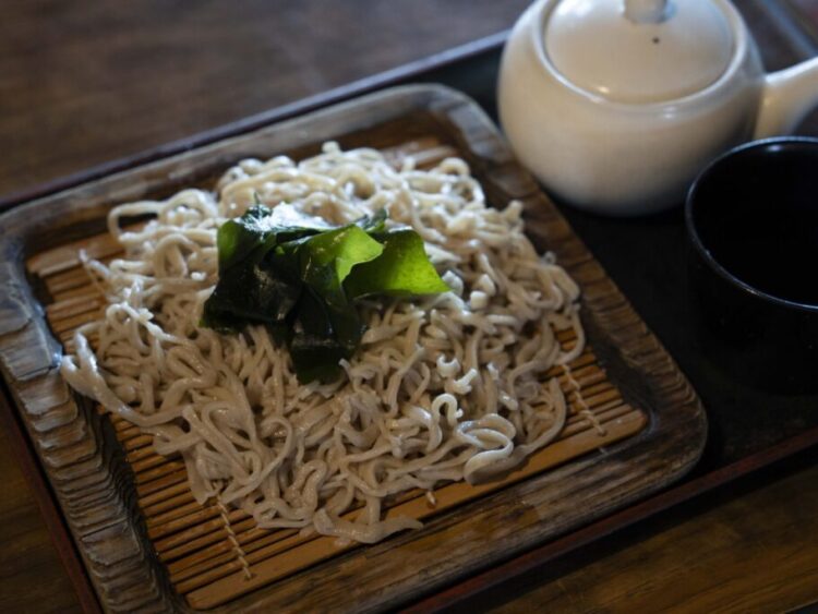 ▲もり蕎麦に無料のワカメを乗せて=甚兵衛
