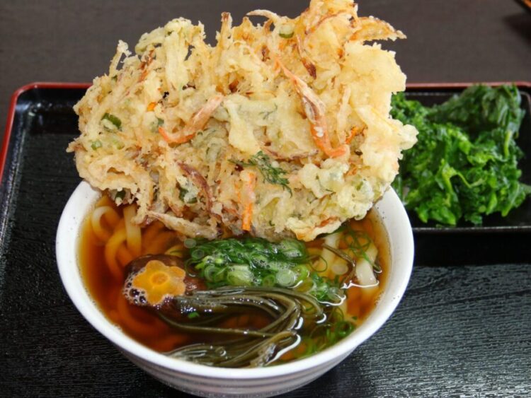 「焼きまんじゅう 田畑」はもり、かけが驚異の390円。自家栽培した野菜のおまけ付き。かき揚げ天やイカ天もあります。