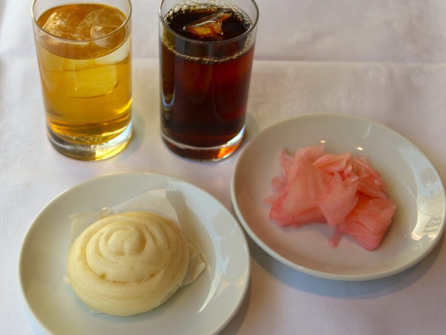 食事中はポットに入れた温かい烏龍茶をいただき、食後は冷たいジャスミン茶で口直し。コーヒーもあったのでアイスコーヒーにして、花巻をデザート代わりに楽しみました。