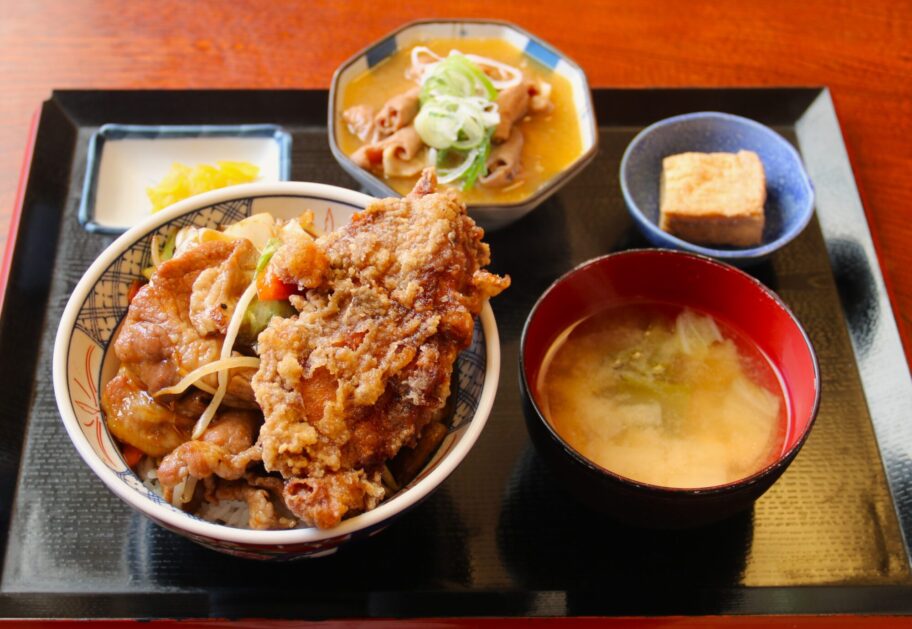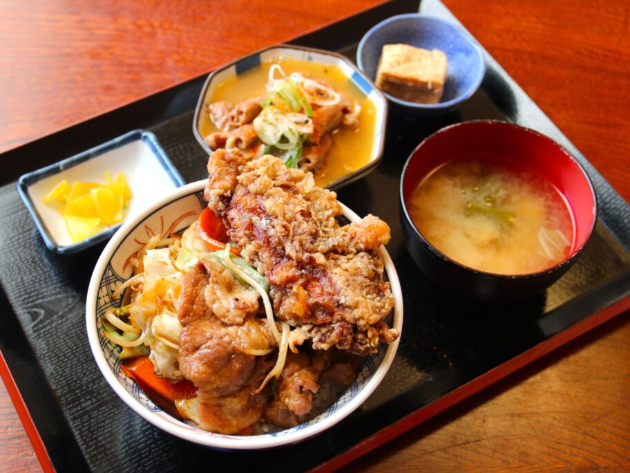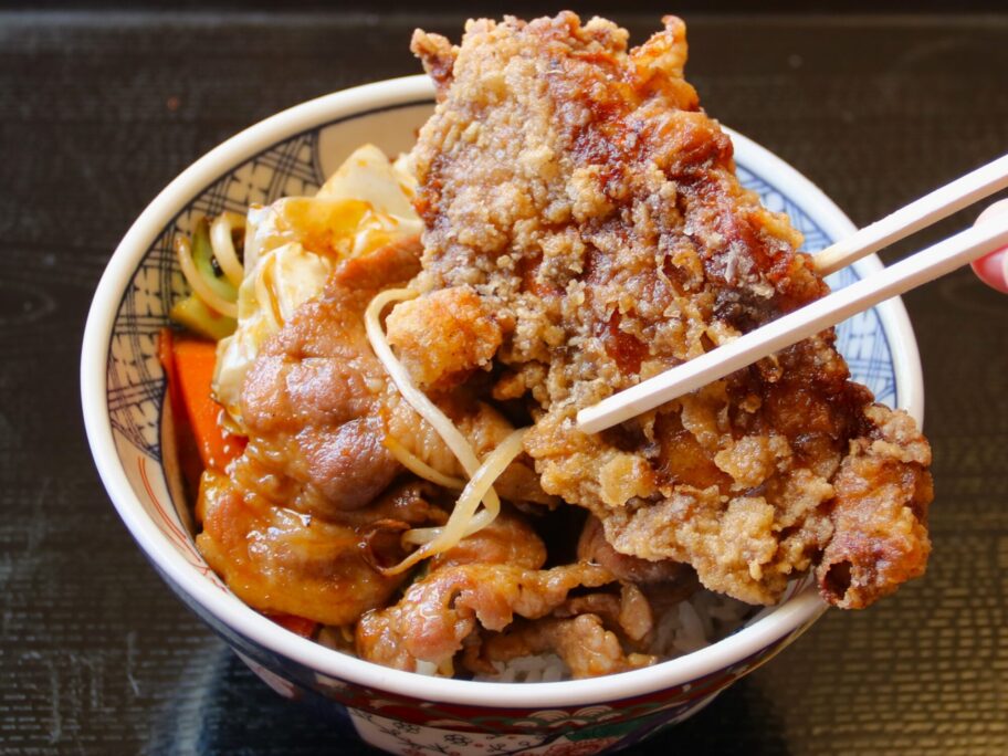 案の定、すごいのが来ました。丼からはみ出さんばかりの大量の焼肉の上に、さらに唐揚げがどん。これに、もつ煮が付いてきました。しかし、まあ、群馬県民が愛する茶色の世界ですね。味噌汁も、厚揚げの煮物の小鉢も同じ色ですから。