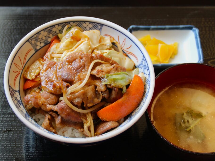 ひとまず唐揚げを避難させ、焼肉丼を攻略しましょう。肉厚の大きな豚肉が3枚にキャベツ、タマネギ、ニンジン、モヤシもたっぷり。辛めのタレで味付けされ、ご飯が進みます。この豚肉、旨い。