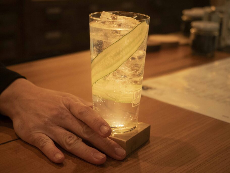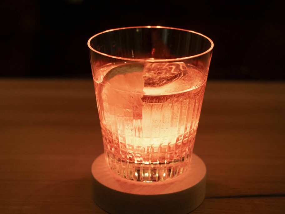 まずはジントニックから。ロンググラスにジンとFEVER-TREEのトニックウォーターを注ぎ、Whiteにはジュニパーベリーの実、Greenには薄くそぎ切りにした前橋産キュウリを添えます。ライトを内蔵した木製コースターにグラスを置くと、炭酸の泡が下から照らされ、きらきらと立ち上がります。「さっぱりしていて美味しい」と、思わず声が出ました。