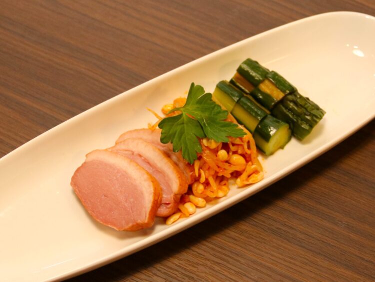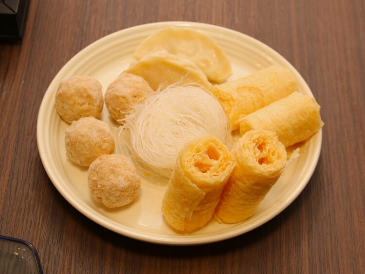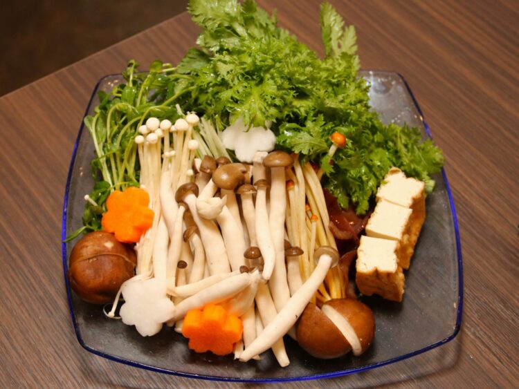 主役は上州麦豚のバラ肉とロース。肉団子、エビ餃子、湯葉、春雨と季節の野菜盛りが脇を固めます。野菜はキノコ4種類、葉物6種類、根菜類2種類。量もたっぷりあり、ますます健康的です。