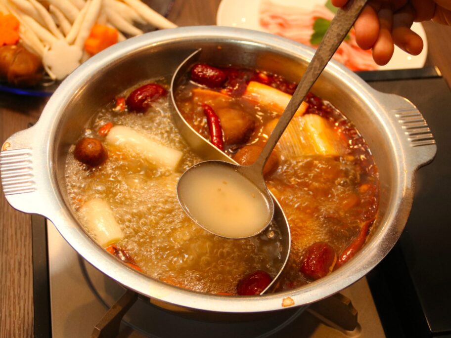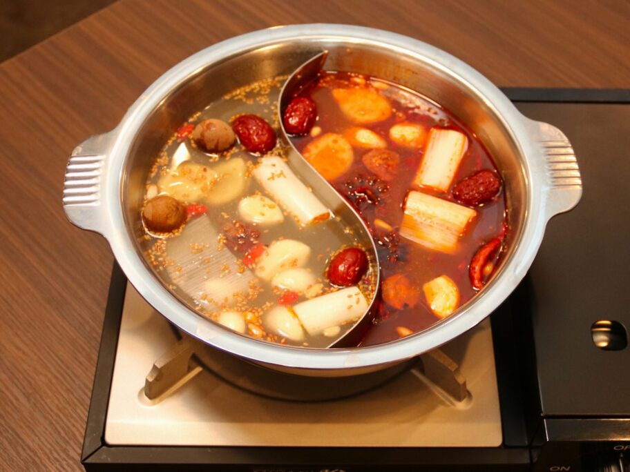 続いては麻辣に。唐辛子や花椒(ホアジャオ)がしっかり効いています。一口飲んだだけで、こめかみから汗が。あっ、でも旨い。辛さの奥に八角などさまざまな薬膳の複合した香りが感じられます。