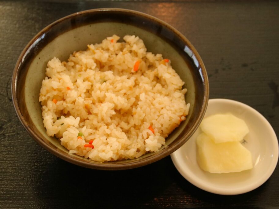 鶏肉の旨みを吸ったご飯は優しい味つけ。べったら漬けに七味をかけて食べたらもう最高でした。