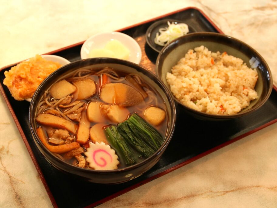 けんちん蕎麦をセットにしました。鶏ごぼうか、なぜかエビピラフ。和洋の炊き込みご飯を選べます。調和を優先して、鶏ごぼうをお願いしました。