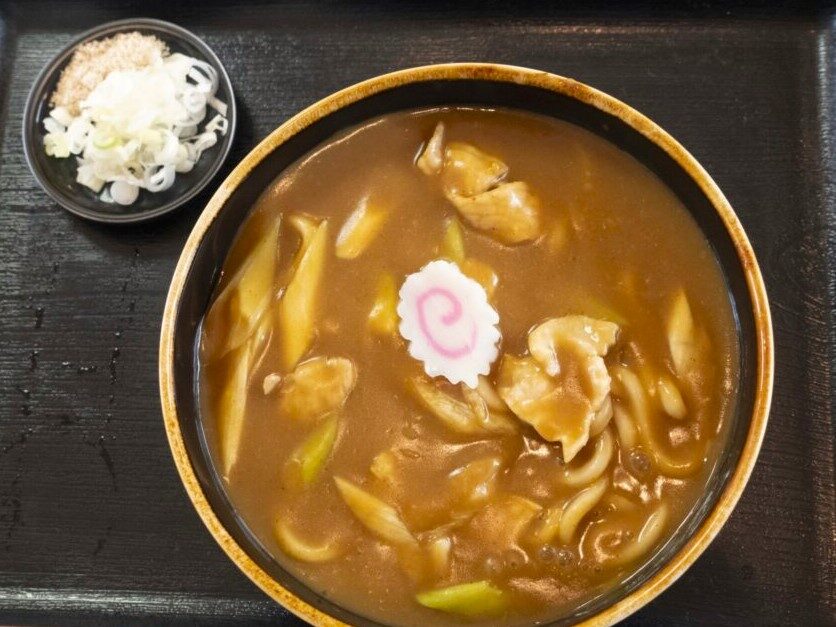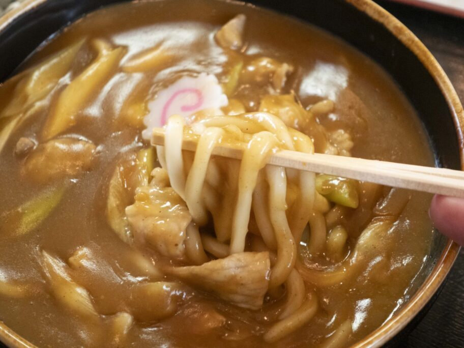 スパイシーさはさほど感じられず、出汁の風味が効いた蕎麦屋さんのカレーです。中太で断面が丸いうどんはもっちもち。カレーによく合いますね。