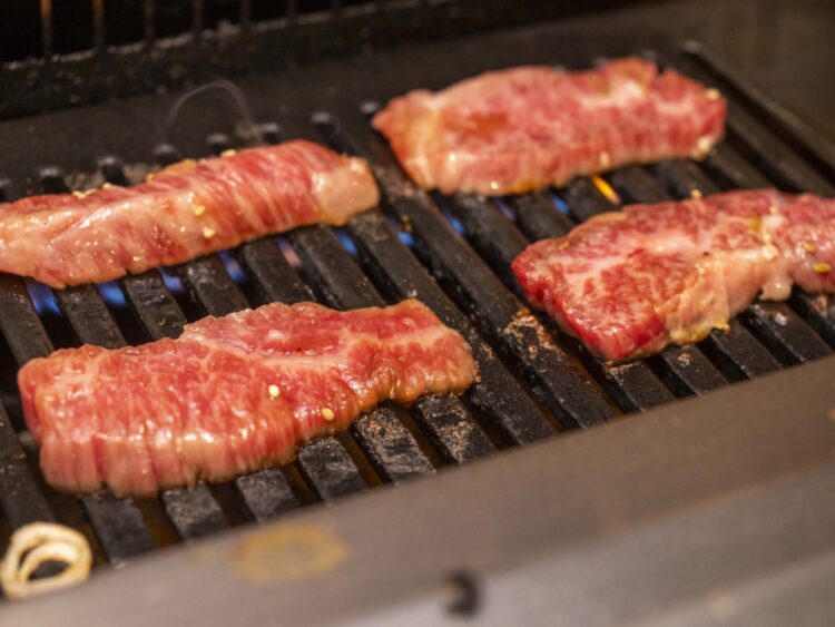 野菜を挟んで牛ロースへ。こちらはさっとレアで。何なら生で行きたいところですが…。いや、きちんと焼きましょう。うん、旨い。