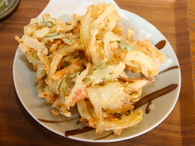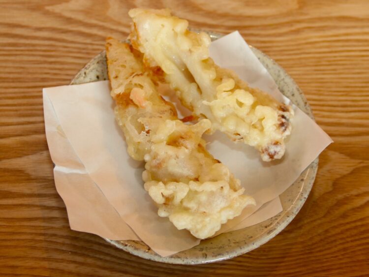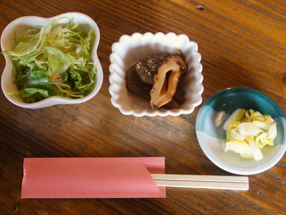 料理の前にサラダと小鉢、漬物が「お通し」で出されます。つまみながら、富田さんが手際よくうどんを茹で、天ぷらを揚げる姿を見て楽しみます。