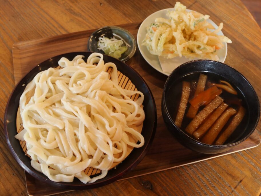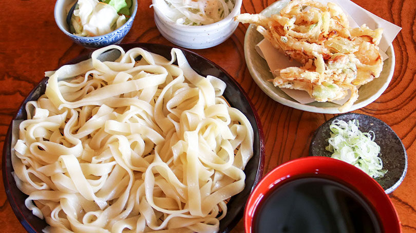 うどんは幅1㌢ほどの平打ちです。足で踏んで一晩寝かせた玉を毎朝5時に起きて、再び踏み込んで打つことで生まれるコシの強さが自慢。硬いのではなく、しなやかで心地よい弾力を感じるうどんです。