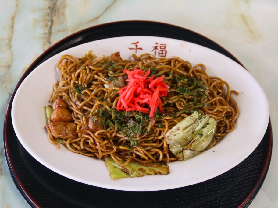 焼きそばも負けじと昭和です。具はキャベツとサイコロ状の豚肉のみ。細麺に青海苔が掛かり、紅ショウガが添えられた、正しい昭和の焼きそばです。