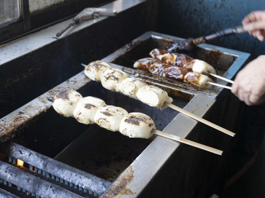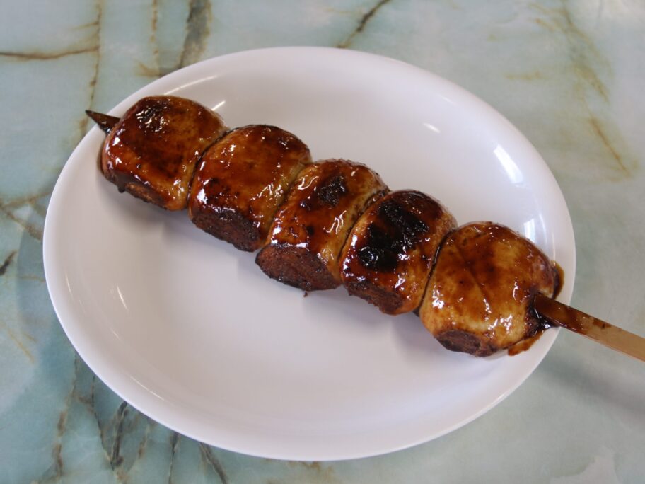 ▲4個でなく、5個刺さった焼きまんじゅう