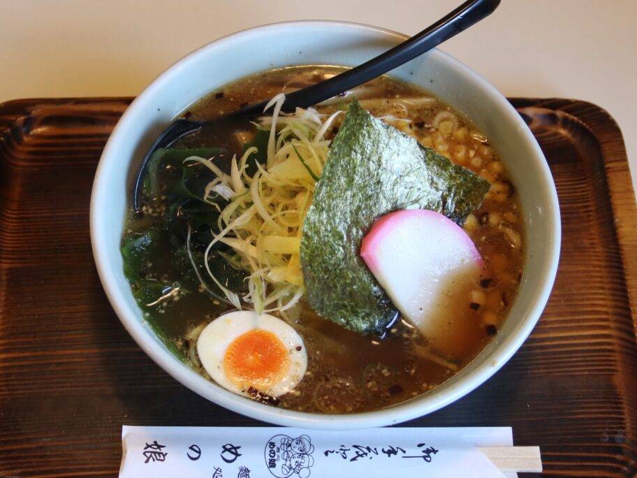 久しぶりの“ご対麺”です。中央にネギの山がこんもり。周りに大きな海苔と肉厚のワカメ、メンマ、コーン、カマボコ、半熟玉子が盛られています。
