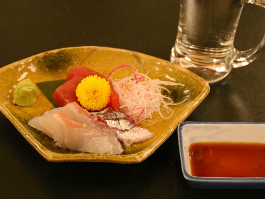 刺身が出てきました。マグロ、タイ、アジの3点盛り。芋焼酎のお湯割りでじっくり飲みますか。厚く切られたマグロの赤身が旨いですね。
