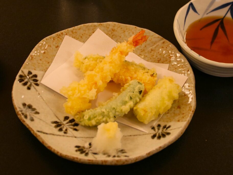 天ぷらの盛り合わせには麦焼酎を炭酸割りで。下仁田ネギの天ぷらが甘くてほくほく。主役のエビを食っちゃいそうです。ネギだけでもよかったかも。