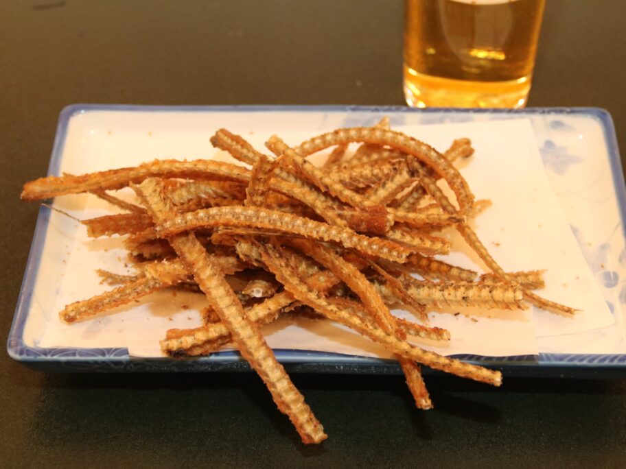乾杯のビールとともにいただくのは鰻の骨を素揚げした骨煎餅。コリコリして、いいつまみになりますし、カルシウムをたっぷりで摂れます。まずは1年(もう残り11カ月か)、健康でいきましょう。