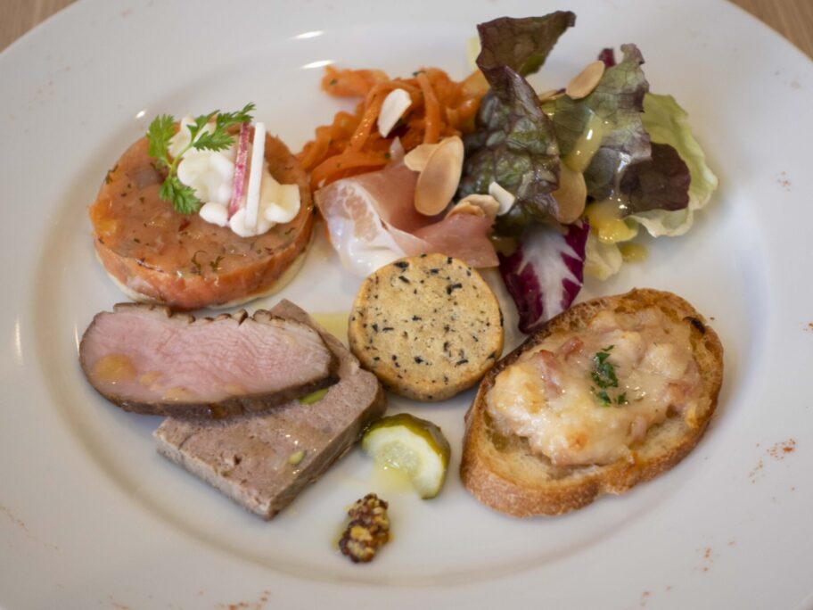 ほどよくクセのある鴨の燻製とテリーヌ。サーモンのタルタルの下には、ジャガイモのクレープが敷かれています。こうしたひと手間がうれしい。