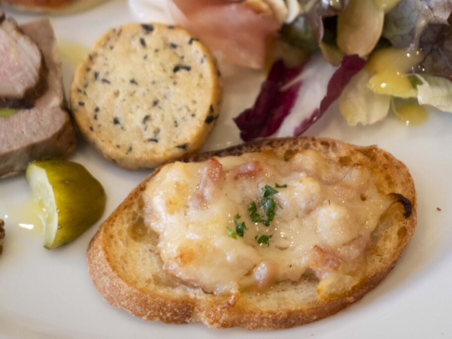 薄いパン生地にチーズや生クリーム、タマネギ、細切りベーコンをのせて焼いたフランスのピッツァ「タルトフランベ」に生ハム、キャロットラぺ。ピクルスや、パルメザンチーズとオリーブで焼いたひと口大のクッキーまで。