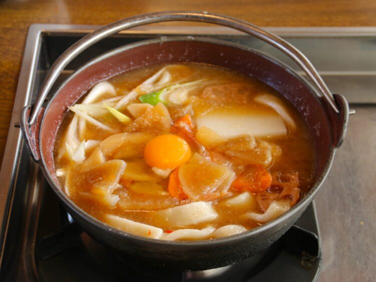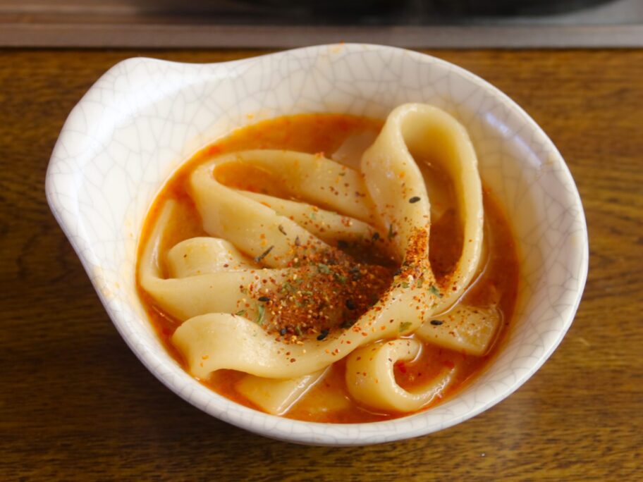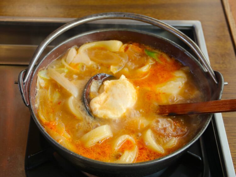 幅1㌢ほどで厚みのあるうどんはコシが強く、歯応え抜群。牛カルビや辛みそが一番合うかも。煮込んでいっても柔らかくならず、味が染みていきます。もしかしたら、2日目が美味しいかも。