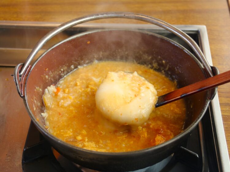 うどんともち以外の具材をいただいたら、「1鍋で2度美味しい」雑炊に。ご飯と汁は1対1が黄金比率。余計な汁は取り出しておきます。