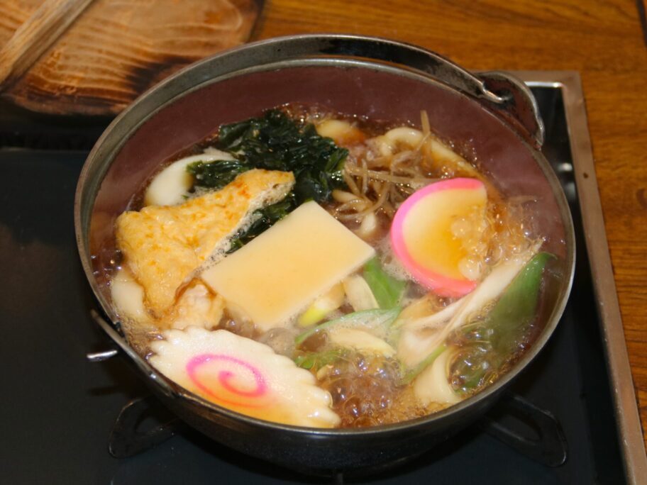 ダイコン、ゴボウ、ニンジン、長ナギと具は根菜類が中心。やはり冬の鍋ですね。シャキシャキした食感はレンコン。つるんとしたコンニャク。もちもありましたが、これは最後のお楽しみに。