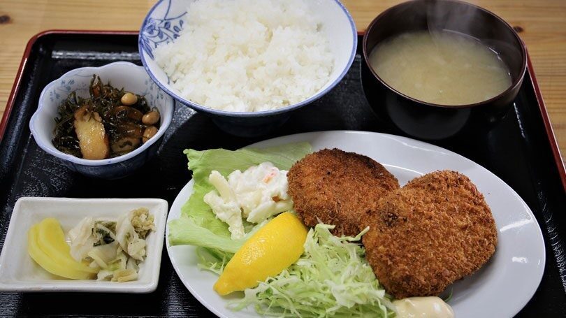 焼魚定食のアジの開きとメンチ・コロッケ定食を分け合って食べるご夫婦。ガテン系のお兄さんはカツ丼とラーメンを一緒に食べています。