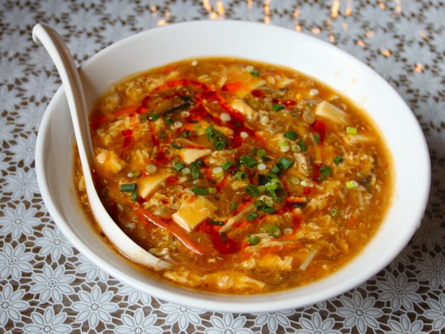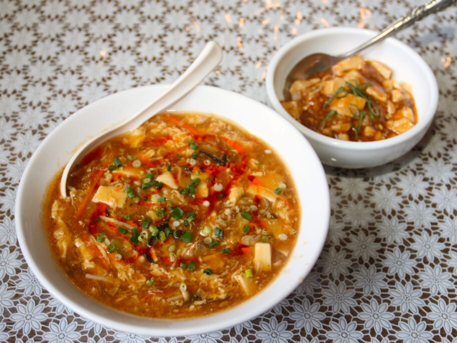 とろみの効いたスープは酸味と辛みが絶妙に絡み合います。細切りの豆腐、豚肉、キクラゲ、シイタケ、ダイコン、ニンジン、ニラ。たくさんの具材がとろみと溶き卵で仲良くまとまっています。