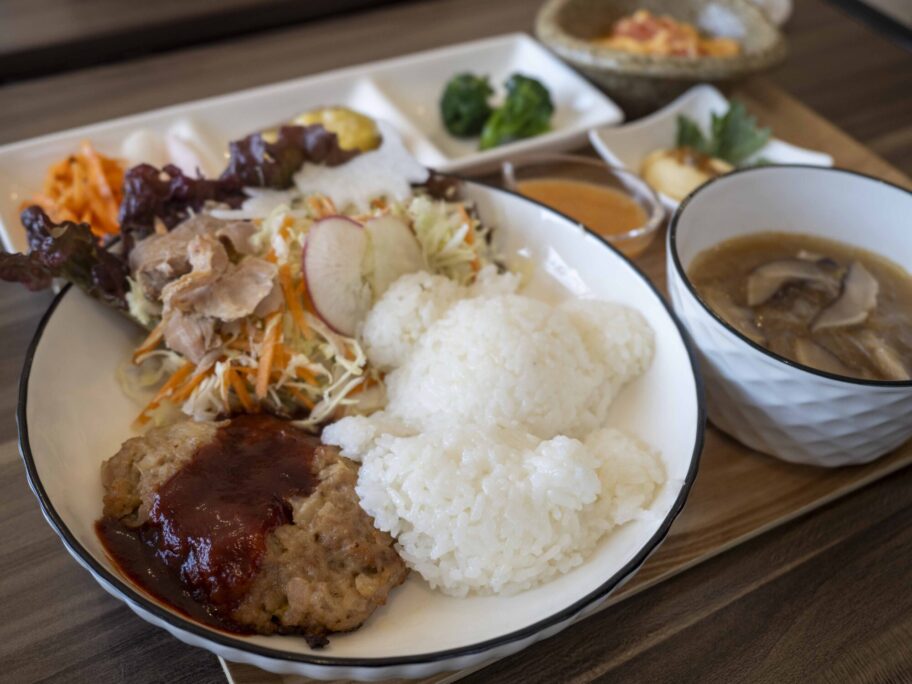 メインはふわふわでやわらかい黒毛和牛のハンバーグ。デミグラスソースがとろりとかかり、肉の甘みを引き立てます。皿には大量のサラダも盛られ、自家製キャロットドレッシングのやさしい甘みがおいしい。
