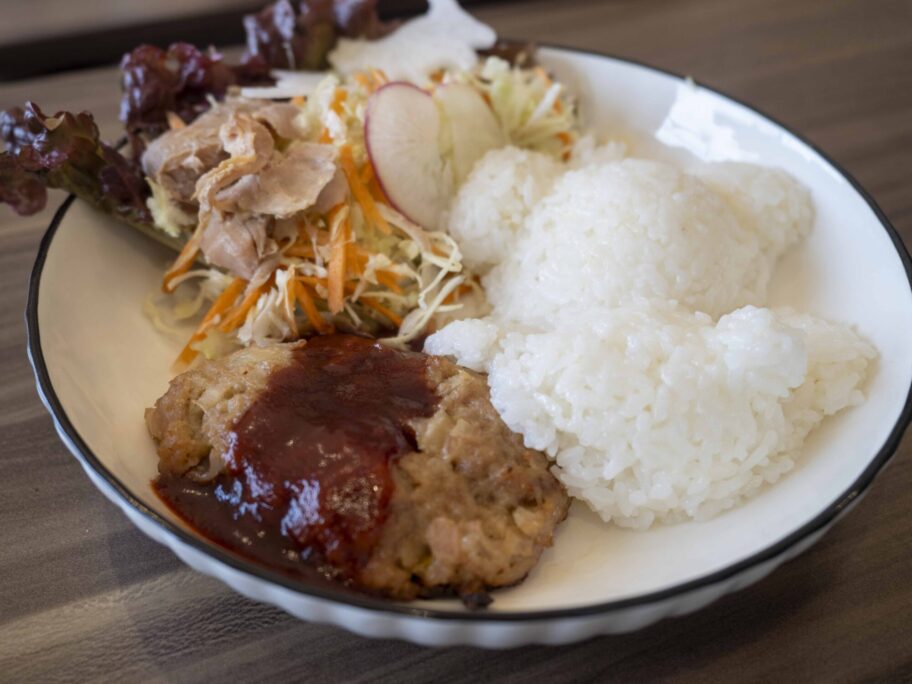 メインはふわふわでやわらかい黒毛和牛のハンバーグ。デミグラスソースがとろりとかかり、肉の甘みを引き立てます。皿には大量のサラダも盛られ、自家製キャロットドレッシングのやさしい甘みがおいしい。