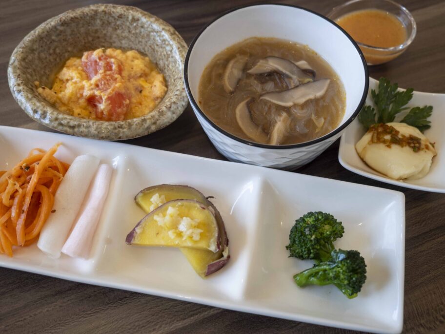 この店の主役は、むしろ副菜の野菜です。キャロットラペはしゃきしゃきで、サツマイモは甘みが強く、ブロッコリーは歯ごたえがあり、噛むほどに甘い。