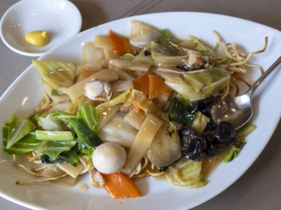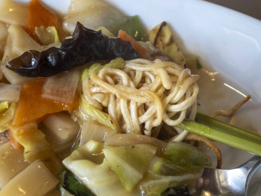 連れが頼んだ五目やわらか焼きそばは、大皿いっぱいに淡い飴色のあんがつやっと広がるタイプ。キャベツやニンジン、タケノコ、きくらげがたっぷり入り、うずら卵がころんと白く目立ちます。海老、イカ、ホタテ、豚肉もところどころ顔を出し、具の層が厚い。あんはとろみが強すぎず、さらりと麺へ流れていきます。