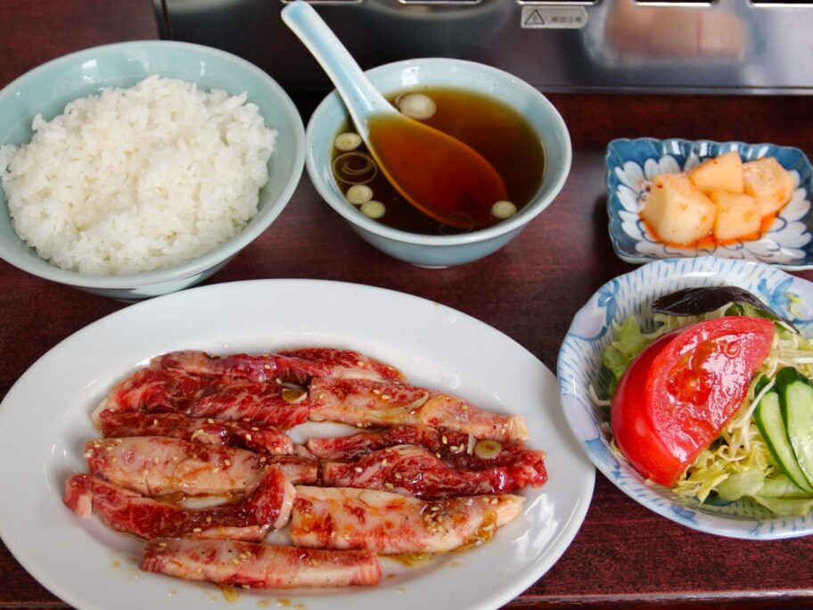 サラダとキムチ、ご飯とスープが配膳され、使い込まれたロースターに火をかけます。準備万端です。