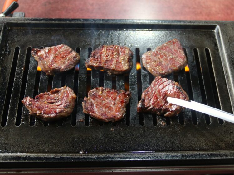 ロースターの火の強い部分に置き、肉の表面に脂が浮かんできたら裏返します。片面は割とよく焼き、もう片面はさっと。タレを絡ませ、そのまま口へ。弾力がありながら、素晴らしく柔らか。口の中で肉汁が溢れてきす。う、旨い。