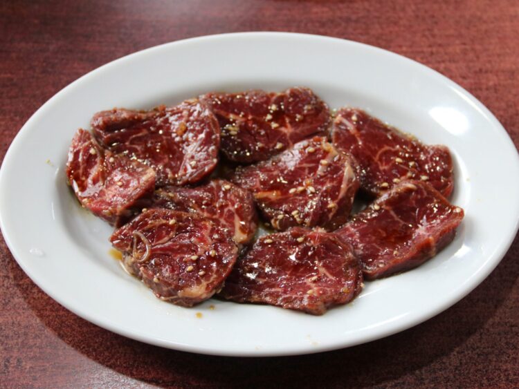 やってきました、ハラミちゃん。なかなか肉厚。艶っぽいあずき色。見ただけで美味しそう。