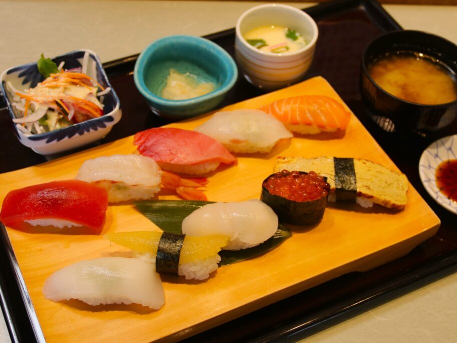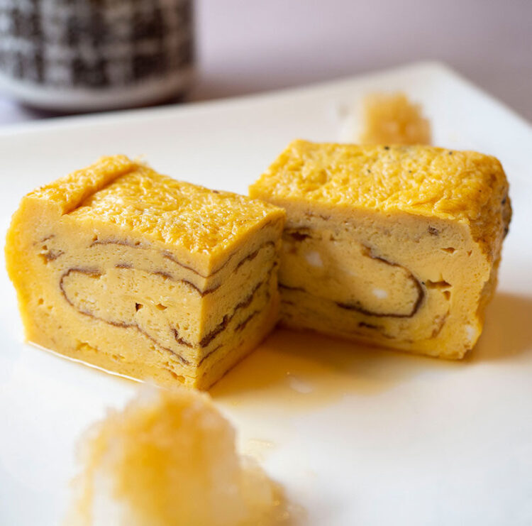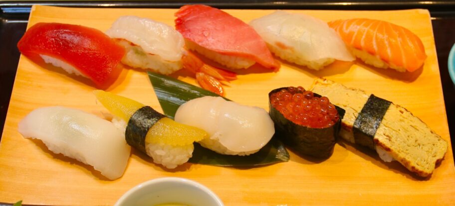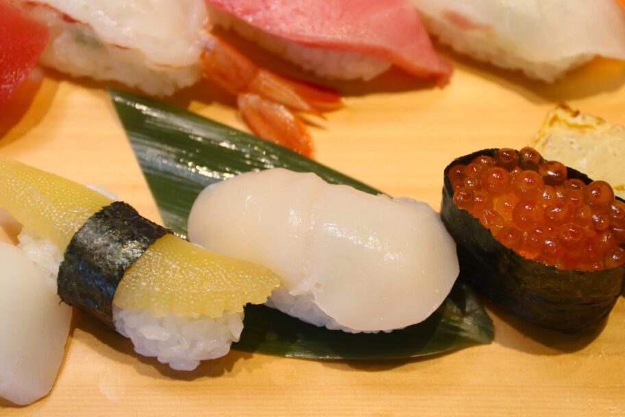 本マグロの中トロにイクラ、分厚いホタテ…。美味しそうなネタが勢ぞろい。まずは玉子焼きから。甘さをぎりぎりまで抑えた寿司屋さんの玉子焼きです。