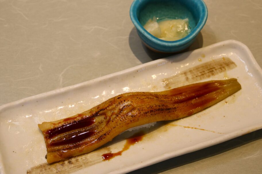 ランチはサラダと茶碗蒸しが付き、これだけでお腹は十分。でも、ここに来たら、あれを食べないと…。そう、穴子です。穴子重は無理なので名物姿焼き大穴子をいただきます。口の中でとろけるような柔らかさ。ふっくらといい煮上がりでした。