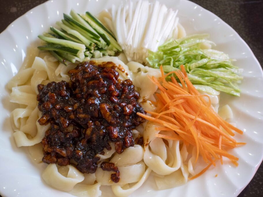 よく混ぜて食べると、麺はもっちり。肉みそのこくに野菜のさっぱり感が重なり、重たくなりすぎません。卓上には唐辛子や酢など調味料も並び、途中で味を変えながら食べられるのも楽しいところです。