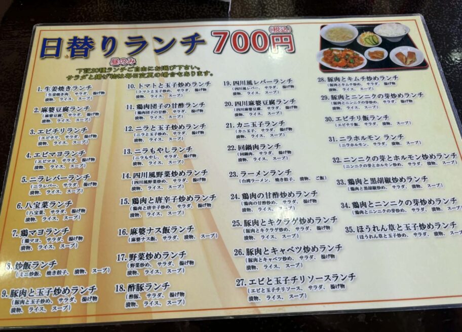 赤い看板に大きく「日替わりランチ700円」とある。気になって店内に入ると、まずメニューの多さに驚きました。日替わりといっても、その日のおすすめが1、2種類並ぶ形ではありません。用意されていたのは35種類。毎日通って、その日の気分で選んでほしい。そんな店の太っ腹さが、最初の一枚のメニュー表から伝わってきます。