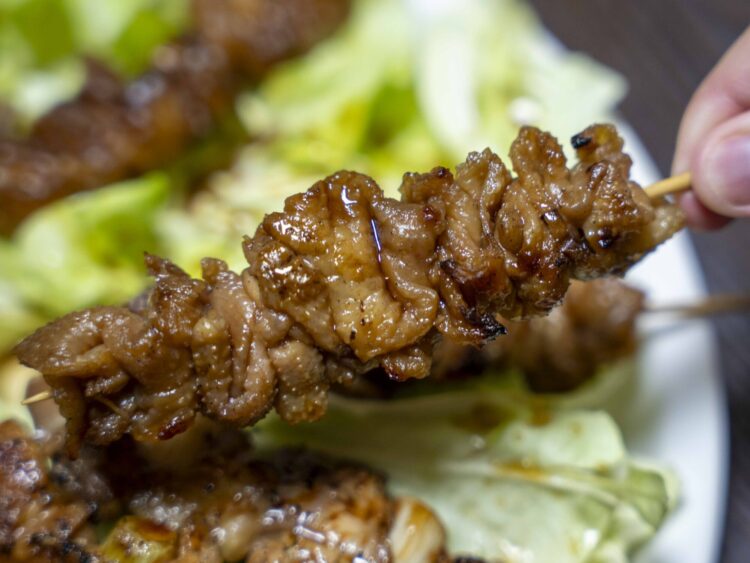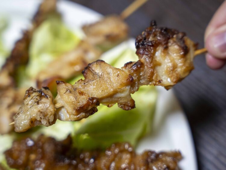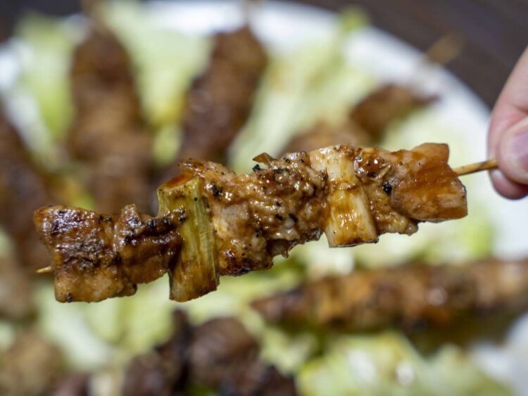 では、自慢のタレをいただきましょう。まずはネギマ。モモ肉ですね。ジューシーで柔らか。間に入るシャキシャキのネギがいい働きします。