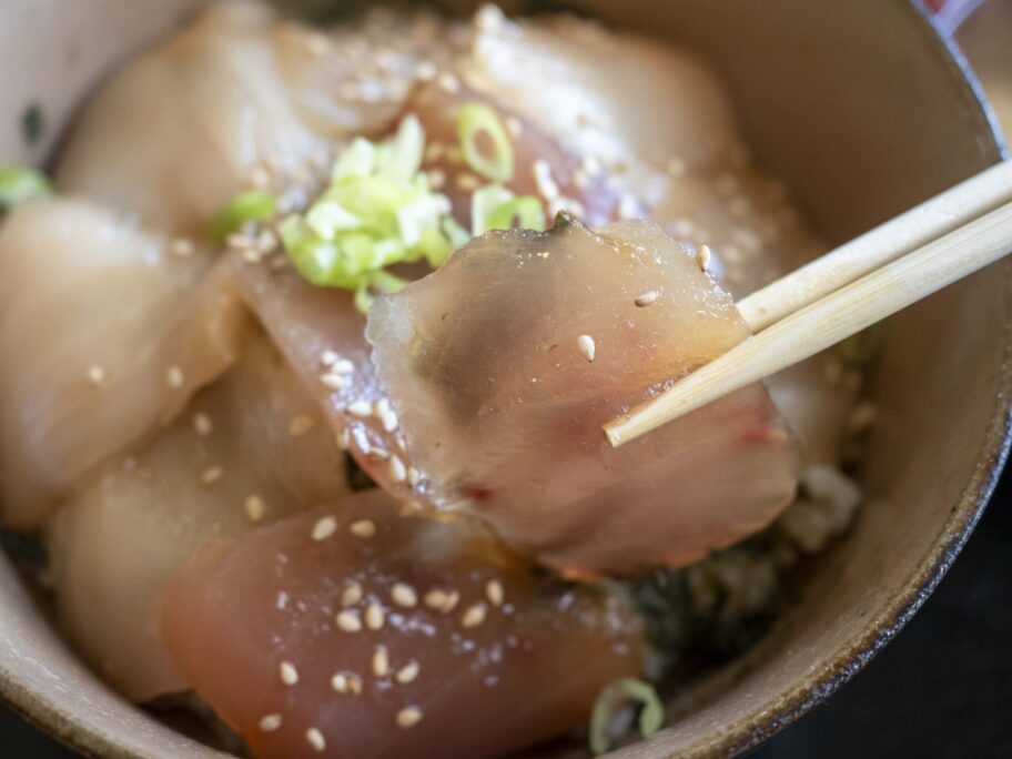 他のマグロに比べると淡白なビンチョウ。漬けにすると、美味しくいただけます。味が染みこみ、食感もねっとりして。赤身はさっぱり、トロはこってり。味の“二重奏”を楽しめます。
