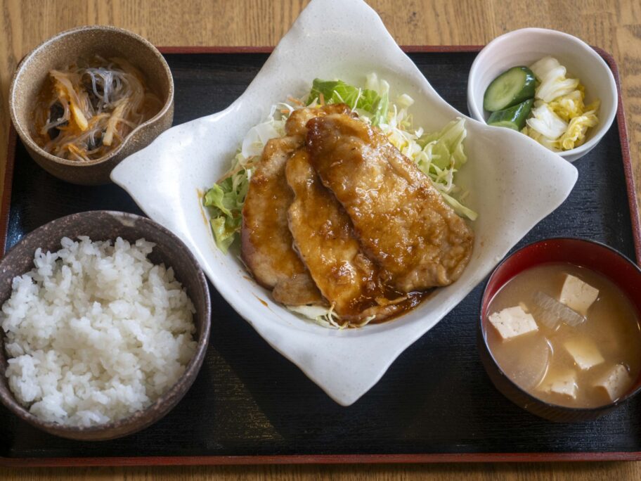 生姜焼きは大きな豚ロースが3枚入り。片栗粉がまぶされ、肉は柔らかく仕上がり、タレが絡みやすくなっています。これはご飯が進むやつですね。1枚いただきました。うん、旨い。
