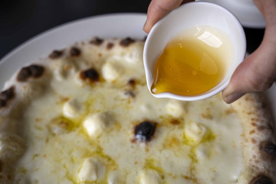 ピッツアはモッツァレラ、クリームチーズ、グラナパダーノの3種をトッピング。そこに添えられるのが、南町の「えみちゃんの純粋はちみつ」です。精製も加糖もしていないはちみつは、濃厚なのにくどくなく、チーズの塩気とこくをぐっと引き立てます。甘いピザというより、はちみつで完成する一枚という印象でした。