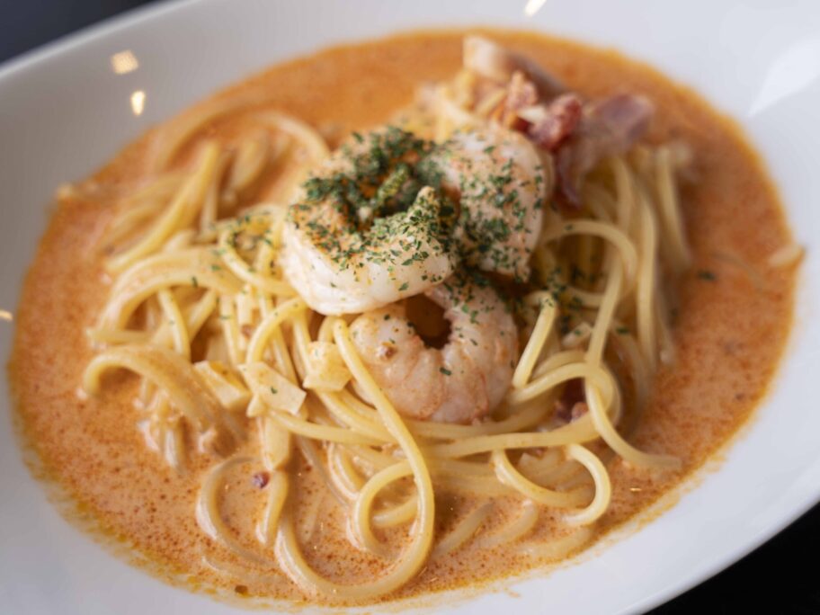 えびのトマトクリームパスタは、ソースがたっぷり。ほんのり甘めの味わいで、麺にしっかり絡みます。ぷりっとした大きなえびが入っているのもうれしく、見た目以上に満足感があります。