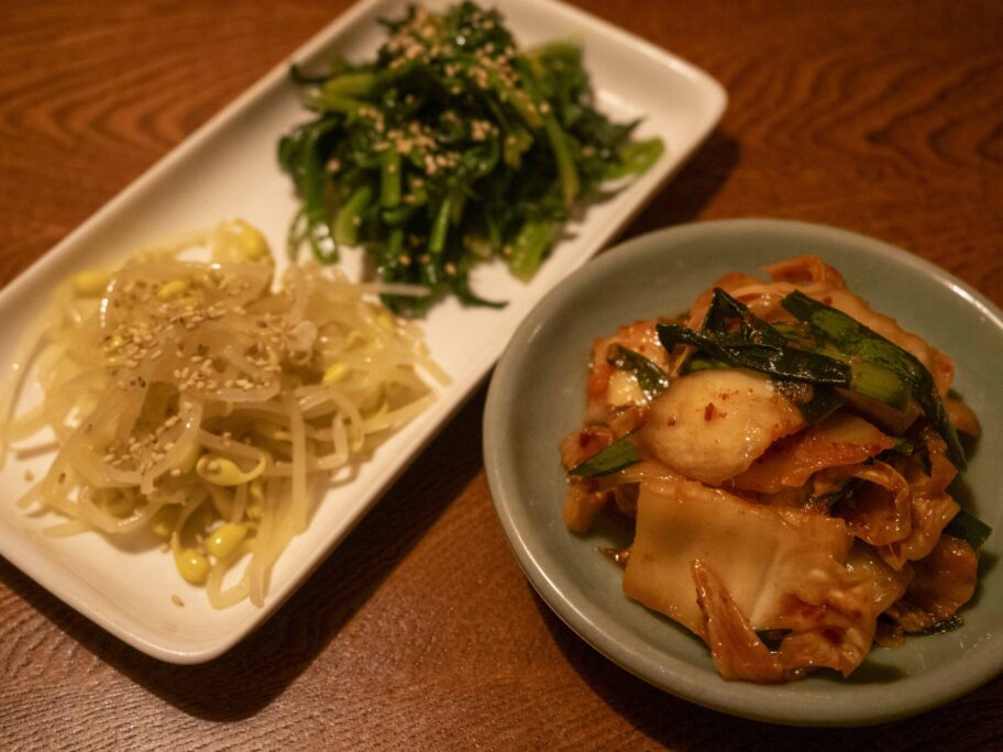 席につくと、お通しはキムチとナムル。キムチは酸味と辛さのバランスがよく、手作りの味です。ナムルもやさしい味付けで、これだけで一杯進みます。