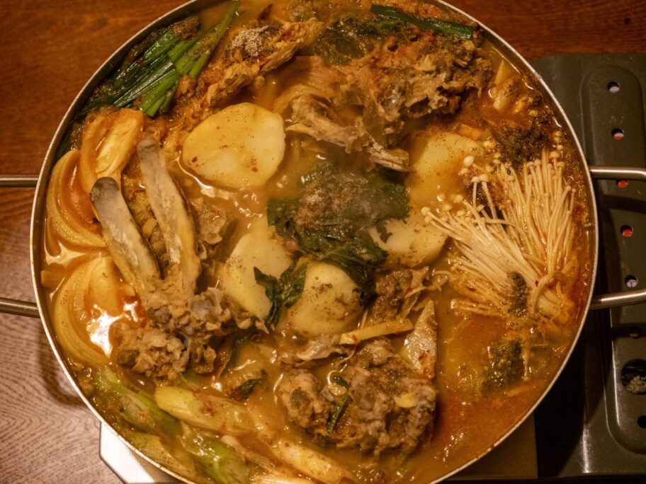 目当てはカムジャタン。直径30センチほどの鉄鍋が、グツグツ言いながら運ばれてきます。具は骨付き肉、ジャガイモ、ニラ、ネギ、玉ねぎ、しいたけ、えのき。エゴマの香りが立ち上がり、食欲を一気に引き上げます。