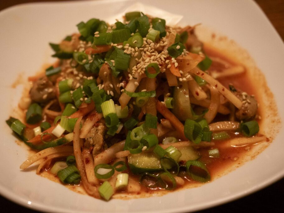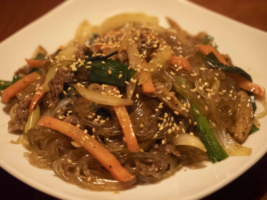 まずはつぶ貝の和え物。コリコリした食感がしっかりしていて、つまみにちょうどいいです。チャプチェは春雨がもちっとしていて、味もしっかり。量もあり、これだけでも満足感があります。