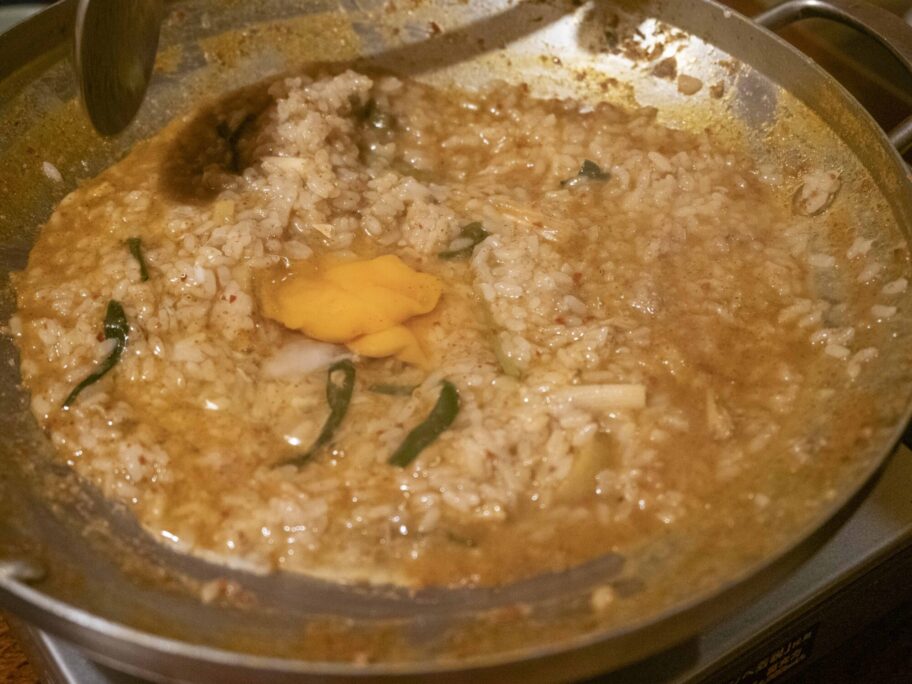 締めは雑炊。オモニがその場で作ってくれます。残ったスープにご飯を入れ、卵を落とし、ゴマ油を回し入れます。仕上げに韓国海苔。旨みを吸ったご飯がしっかりおいしく、ここまで食べると満腹になります。